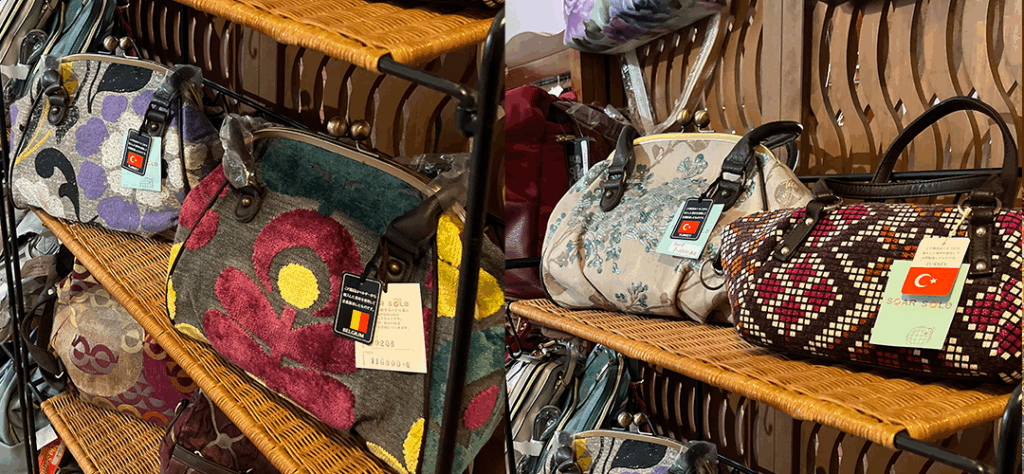 トルコやベルギーまなどの生地を使ったバッグ、インドネシアの伝統織物(イカット)製の小物入など多彩です。